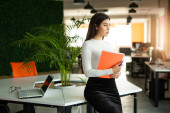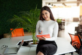 piękna młoda kobieta w okularach przy stole z laptopem w biurze
