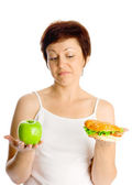 Dziewczyna z jabłkiem i hamburgera w jasnym pomieszczeniu