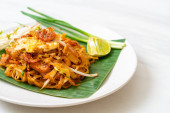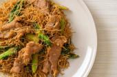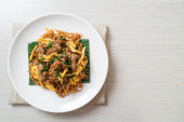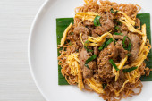 smażony makaron instant z wieprzowiną i jajkiem - azjatycki lokalny styl street food