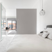 Nowoczesna i jasna sypialnia z wygodnym łóżkiem z drewnianą ramą, szafa z lustrzanymi drzwiami i stylową sztuką