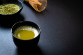 Japońska organiczna matcha zielona herbata w misce z łyżką chashaku i chasen bambusowa trzepaczka na czarnym drewnianym tle. Zdrowy produkt z natury typowej dla japońskiej tradycji. Pojęcie ceremonii herbaty.