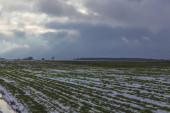 Rolnictwo. Pokryte śniegiem rzędy pszenicy. Zielona pszenica pod śniegiem.