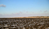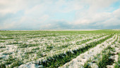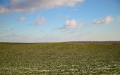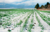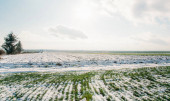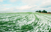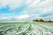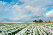Rolnictwo. Pokryte śniegiem rzędy pszenicy. Zielona pszenica pod śniegiem.