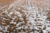 Rolnictwo. Pokryte śniegiem rzędy pszenicy. Zielona pszenica pod śniegiem.