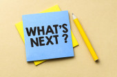 Napis gdzie następne drewniane litery na niebieskim tle, widok z góry
