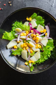 sałatka warzywna ziemniak z sałatą kukurydzianą i kukurydzą na stole zdrowy posiłek przekąska odkryty widok z góry kopiuj miejsce na tekst jedzenie tło obraz rustykalny