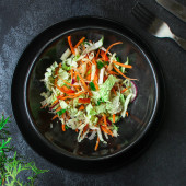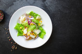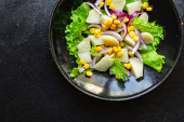 sałatka warzywna ziemniak z sałatą kukurydzianą i kukurydzą na stole zdrowy posiłek przekąska odkryty widok z góry kopiuj miejsce na tekst jedzenie tło obraz rustykalny