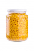 Kukurydza cukrowa w szklanym słoiku izolowana na białym