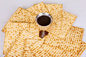 Żydowski flatbread matza na Paschę, filiżanka wina i orzechów włoskich na drewnianym tle