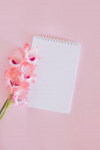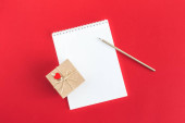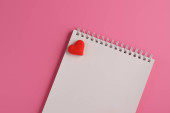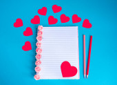 Notatnik z pustą kartką, ołówkiem i czerwonymi sercami na różowym tle. Leżeć płasko. Miejsce na tekst.