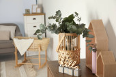 Stylowe wnętrze salonu z drewnianą drabiną i roślinami