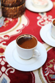 ISTANBUL, TURKEY - PAŹDZIERNIK 21, 2020: filiżanka kawy, wody, słodyczy i kwiatów na talerzu w kawiarni