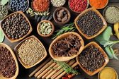 Asortyment ziół i przypraw w misach tworzących barwne abstrakcyjne tło. Płaskie ułożenie, widok z góry.