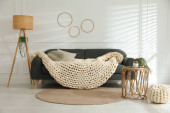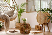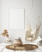 Zdjęcie "Wygodne krzesło hamakowe w stylowym pokoju. Projekt wnętrza" może być wykorzystywane do celów osobistych i komercyjnych zgodnie z warunkami zakupionej licencji Royalty-free. Obraz jest dostępny do pobrania w jakości wysokiej rozdzielczości do 5760x3840.