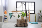 Wygodne krzesło hamakowe w stylowym pokoju. Projekt wnętrza
