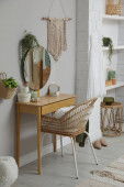 Zdjęcie "Wygodne krzesło hamakowe w stylowym pokoju. Projekt wnętrza" może być wykorzystywane do celów osobistych i komercyjnych zgodnie z warunkami zakupionej licencji Royalty-free. Obraz jest dostępny do pobrania w jakości wysokiej rozdzielczości do 5760x3840.