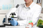 Naukowiec z brokułami przy stole w laboratorium, zbliżenie. Wykrywanie trucizny