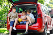 Zdjęcie "Mały chłopiec siedzi w bagażniku samochodu tuż przed wyjazdem na letnie wakacje. Tata pakuje walizki. Szczęśliwa rodzina wyrusza w długą podróż w czasie okupacji i kwarantanny z powodu pandemii korony" może być wykorzystywane do celów osobistych i komercyjnych zgodnie z warunkami zakupionej licencji Royalty-free. Obraz jest dostępny do pobrania w jakości wysokiej rozdzielczości do 5760x3840.