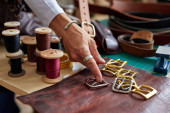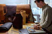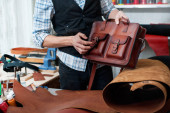 wykwalifikowany rzemieślnik w fartuchu pracujący ze skórą w warsztacie