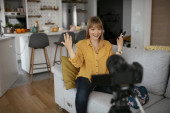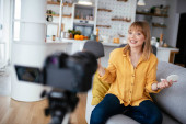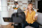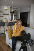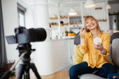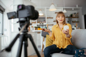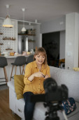 Zdjęcie "Kobieta vlogger nagrywania tutorial makijażu dla swojego kanału. Młoda piękna kobieta nagrywania uzupełnić tutorial podzielić się w mediach społecznościowych." może być wykorzystywane do celów osobistych i komercyjnych zgodnie z warunkami zakupionej licencji Royalty-free. Obraz jest dostępny do pobrania w jakości wysokiej rozdzielczości do 5760x3840.