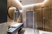 Zdjęcie "Wnętrze łazienki nowoczesnego domu" może być wykorzystywane do celów osobistych i komercyjnych zgodnie z warunkami zakupionej licencji Royalty-free. Obraz jest dostępny do pobrania w jakości wysokiej rozdzielczości do 5760x3840.