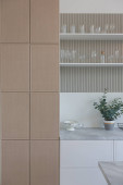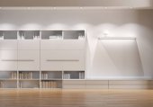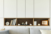 Biała drewniana szafa z otwartymi półkami w sypialni nowoczesnego domu