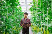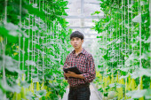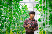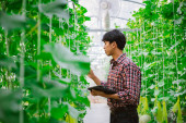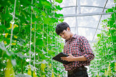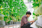 Zdjęcie "Rolnik sprawdza jakość melona na farmie melonów w plastikowym domu. " może być wykorzystywane do celów osobistych i komercyjnych zgodnie z warunkami zakupionej licencji Royalty-free. Obraz jest dostępny do pobrania w jakości wysokiej rozdzielczości do 5760x3840.