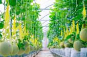Rolnik sprawdza jakość melona na farmie melonów w plastikowym domu.