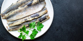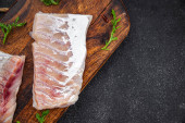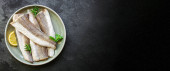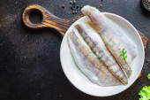 morszczuk ryby surowy filet owoce morza Omega witaminy gotowe do jedzenia na stole zdrowy posiłek przekąska odkryty góry widok ksero miejsce na tekst jedzenie tło obraz rustykalny dieta pescezyjna