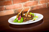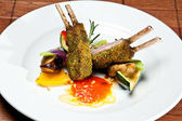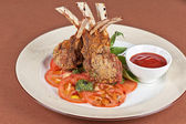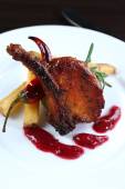Przepiórka smażone mięso z sosem na białym talerzu