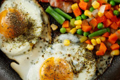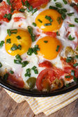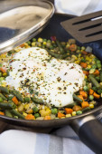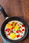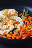 smażone jajka i warzywa na patelni, zbliżenie, miejsce na tekst