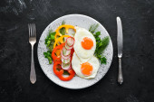 smażone jajka i warzywa na białym talerzu na stole pokrytym białym obrusem