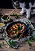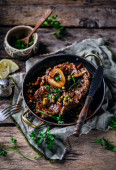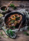 Cielęcina ossobucco z zielonym groszkiem.selektywne focus.style rustykalnym