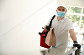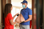 Zdjęcie "Kelner ze spakowanym zamówieniem na wynos i znakiem OPEN w pobliżu restauracji. Usługi gastronomiczne podczas kwarantanny dla koronawirusów" może być wykorzystywane do celów osobistych i komercyjnych zgodnie z warunkami zakupionej licencji Royalty-free. Obraz jest dostępny do pobrania w jakości wysokiej rozdzielczości do 5760x3840.