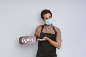 Kelner ze spakowanym zamówieniem na wynos i znakiem OPEN w pobliżu restauracji. Usługi gastronomiczne podczas kwarantanny dla koronawirusów