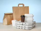 Jednorazowe opakowania ekologiczne z kubkiem papieru i żywności rzemieślniczej papieru na drewnianym stole w domu, Usługa zamówienia żywności online dostawy pudełko zabrać pudełka