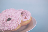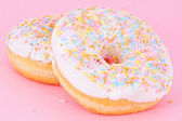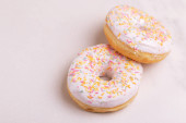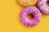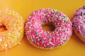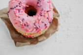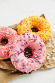 dwa smaczne różowy i żółty dom wykonane apetyczne pączki szkliwione na papierze kraft do dostawy, pionowa zawartość żywności, selektywne skupienie