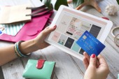 Kobieta z kartą kredytową przy użyciu laptopa do zakupów online w domu, zbliżenie