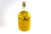 Oliwa z oliwek i gałązka oliwna w szklanym dzbanku na białym tle. Obok niego papryka, czosnek i ziele angielskie. Miejsce na SMS-a. Zbliżenie.