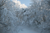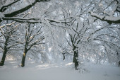 Ścieżka w bukowym lesie Monte Pettino pokrytym śniegiem