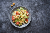 Pieczona pierś z kurczaka i sałatka z pomidorami na konkretnym tle. Zdrowe jedzenie, dieta keto, dieta paleo. Widok z góry z miejsca kopiowania.