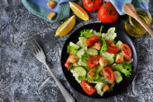 Zdjęcie "Pieczona pierś z kurczaka i sałatka z pomidorami na konkretnym tle. Zdrowe jedzenie, dieta keto, dieta paleo. Widok z góry z miejsca kopiowania." może być wykorzystywane do celów osobistych i komercyjnych zgodnie z warunkami zakupionej licencji Royalty-free. Obraz jest dostępny do pobrania w jakości wysokiej rozdzielczości do 5760x3840.