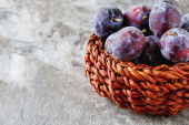 Kosz świeżych śliwek na drewnianym stole, zbliżenie