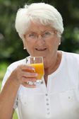 starsza kobieta uśmiechający się z soku pomarańczowego