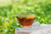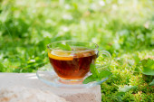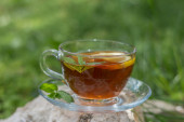 Różne zioła parzone w szklanym czajniku na drewnie przed białą ścianą. Dwie szklanki lipy, kwiaty granatu, zielona herbata, nasiona winogron, liście oliwek, paluszki cynamonowe i suszona róża.