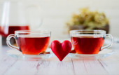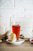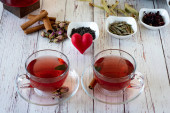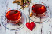 Odmiany ziół parzonych w szklanym czajniku na drewnie przed białą ścianą. Lipa, kwiat granatu, zielona herbata, nasiona winogron, liście oliwek, paluszki cynamonowe i suszona róża.Wybrane serce ostrości