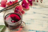 Odmiany ziół parzonych w szklanym czajniku na drewnie przed białą ścianą. Lipa, kwiat granatu, zielona herbata, nasiona winogron, liście oliwek, paluszki cynamonowe i suszona róża.Wybrane serce ostrości