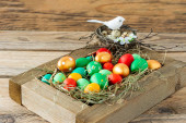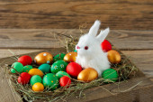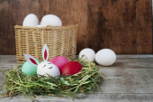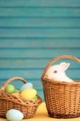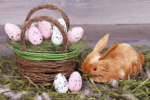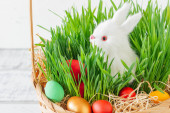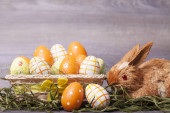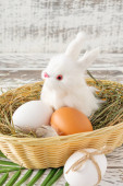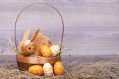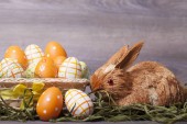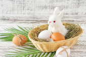 Świąteczna kompozycja wielkanocna z małym króliczkiem siedzącym w koszyku z pisanką. Styl rustykalny, ekologiczny i koncepcja rolników.