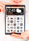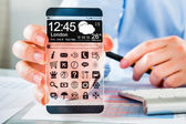smartphone rezygnować przeźroczysty ekran w ludzkich rąk.