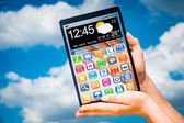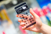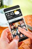 smartphone rezygnować przeźroczysty ekran w ludzkich rąk.